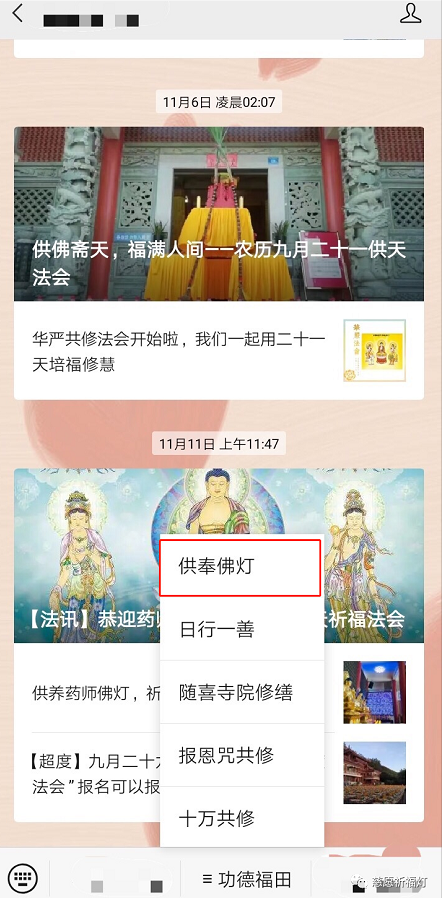 寺院捐贈系統中的供燈祈福模塊讓信眾通過微信公眾號、APP或觸摸屏、現場掃碼線上線下按天、按月、按年付費供燈,直播查看祈福信息。
